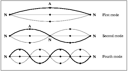 1.5 কম্পনের মোডঃ যখন কোনও সিস্টেমকে আঘাত করা হয় এবং তার নিজস্ব ডিভাইসে ছেড়ে দেওয়া হয়, তখন তার যে কোনও সম্ভাব্য গতি থাকে, প্রতিটি সিস্টেমের নিজস্ব ফ্রিকোয়েন্সি সহ সিস্টেমের প্রাকৃতিক কম্পন মোডের একটি সংগ্রহ নিয়ে গঠিত হয়। নিম্নলিখিত চিত্রটি একটি প্রসারিত স্ট্রিংয়ের আড়াআড়ি কম্পনের প্রথম চারটি মোডের আকার, বৈশিষ্ট্যগুলি দেখায়। প্রথম মোডের চরিত্রগত আকারে সর্বদা শুধুমাত্র একটি কুঁজো থাকে, যা মৌলিক ফ্রিকোয়েন্সির শব্দ তৈরি করে, যাকে 1ম হারমোনিক বলা হয়। দ্বিতীয় মোডে দুটি হাম্প থাকে, উৎপাদিত শব্দকে দ্বিতীয় হারমোনিক বলা হয়। তৃতীয় মোডে তিনটি হাম্প রয়েছে, উত্পাদিত শব্দকে তৃতীয় সুরেলা বলা হয় ইত্যাদি।