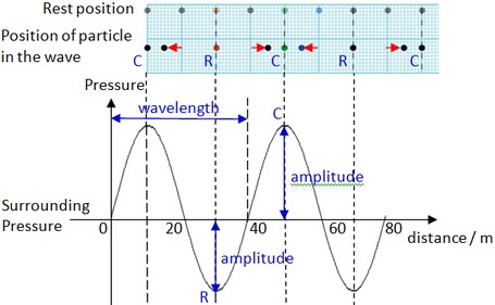বাতাসের ভর এবং স্থিতিস্থাপকতা রয়েছে, তাই শক্তির যে কোনও উৎস তরঙ্গ আকারে বায়ুর চাপে ওঠানামা ঘটাবে। শব্দ তরঙ্গ হল এক ধরনের চাপ তরঙ্গ যা বাতাসের মতো পরিবাহী মাধ্যমে কোনও বস্তুর কম্পন দ্বারা সৃষ্ট হয়। বিকল্পভাবে, শব্দ হল এমন একটি কম্পন যা বাতাসের মতো মাধ্যমের মাধ্যমে চাপের তারতম্য এবং স্থানচ্যুতির সাধারণত শ্রবণযোগ্য যান্ত্রিক তরঙ্গ হিসাবে প্রচারিত হয়। এই তরঙ্গ একটি অনুদৈর্ঘ্য তরঙ্গ। তরঙ্গ বরাবর একটি নির্দিষ্ট বিন্দুতে বায়ুর অণুগুলি হয় বন্ধ হয়ে যাবে [সংকোচন] অথবা ছড়িয়ে পড়বে [বিরল ক্রিয়া]। এই ধরনের চাপের বৈচিত্র্যের গ্রাফিক্যাল উপস্থাপনা নিম্নলিখিত চিত্রে দেখানো হয়েছেঃ