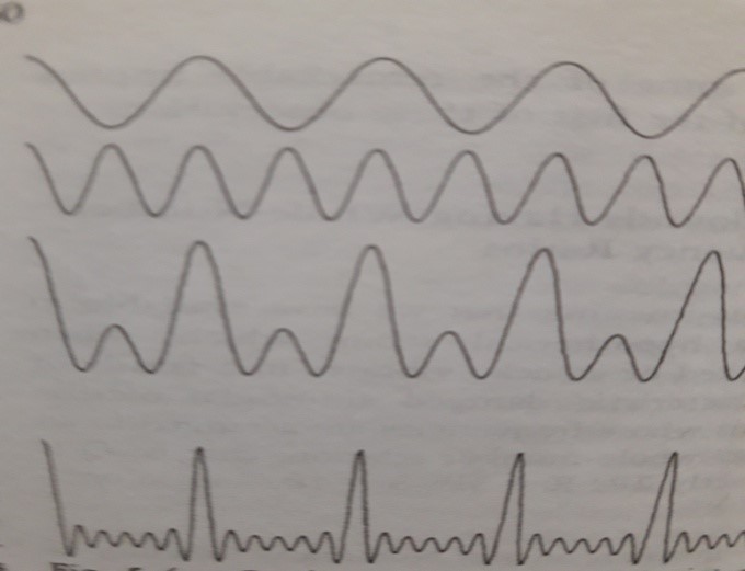 চিত্র 2.1 এর শীর্ষ দুটি অংশ সাইনোসয়েডগুলি দেখায় যার ফ্রিকোয়েন্সি দুটি ফ্যাক্টর দ্বারা পৃথক হয়। যদি একটি সরলীকৃত স্ট্রিং উত্তেজিত হতে পারে, কোনও উপায়ে, এটি কেবলমাত্র চরিত্রগত দোলনগুলির প্রথম দুটি গতিতে সেট করে তবে অসিলোস্কোপ চিত্রটি ডুমুরের তৃতীয় অংশে দেখানো বক্ররেখার মতো কিছু দেখাবে। 2.1, প্রথম দুটি বক্ররেখা যোগ করে প্রাপ্ত, একটি পর্যায়ক্রমিক গতি। এটি লক্ষ করা উচিত যে পুনরাবৃত্তির হার ঠিক উপরের বক্ররেখার সমান। চিত্রটির নীচের অংশটি অতিরিক্ত সাইনোসয়েডগুলির সংমিশ্রণের ফলাফল দেখায়, যা আমাদের বিশেষভাবে নির্বাচিত সেটের প্রথম ছয়টি দোলনগুলির যোগফলের অন্তর্গত, আবার একটি পর্যায়ক্রমিক গতি।
